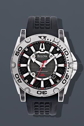 From the Precisionist Champlain Collection. The most accurate watch in the world with a continuously sweeping second hand. In stainless steel with black carbon fiber accents, rotating bezel, multiple-layer black carbon fiber, charcoal gray and silver dial with screw-head detailing, red continuously sweeping second hand, luminous hour and minute hands, luminous markers, calendar, 24-hour track, screw-back case, screw-down crown, patterned black rubber strap, and water resistance to 300 meters.